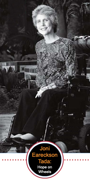 Joni was only the first of 35 books, all of which bring hope and love into their readers’ lives. But they are only a part of what Joni has found the strength to do. Now 59, she does a daily five-minute radio show, broadcast to 1,000 stations with more than a million listeners a week. She holds roughly 18 Family Retreats (joniandfriends.org) every year for special needs people and their families. She heads Wheels for the World, which collects, fixes, and ships wheelchairs for poor people. And she heads the Joni and Friends International Disability Center that works with the United Nations on disability issues and trains church staff and volunteers to work with those affected by disability.